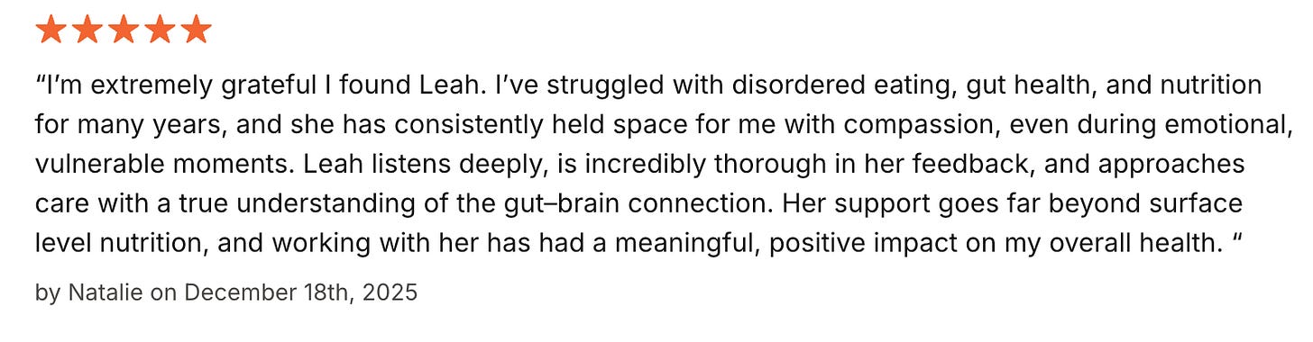 Holistic Nutrition Support with Leah: Looking for holistic, whole-person nutrition support? I’ve coached 400+ people to improve their metabolic health, overcome eating challenges, build body trust, heal from chronic digestive disorder, simplify meal planning, and support well-being holistically. Read patient reviews and book your session covered by insurance.